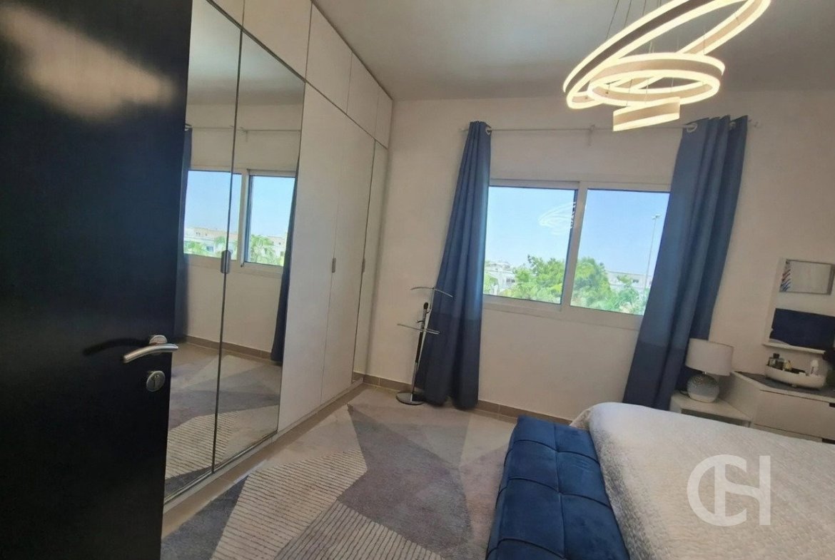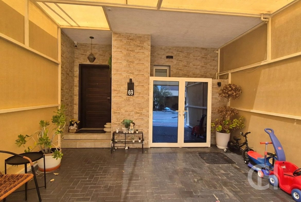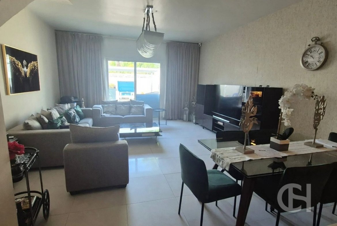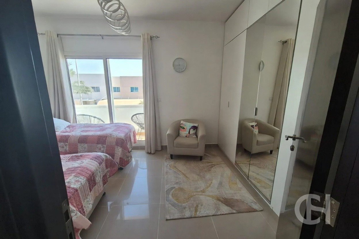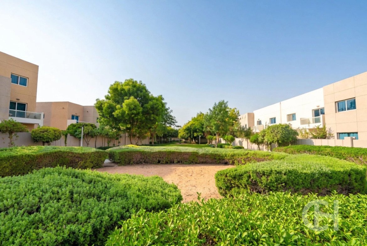This 3 bedroom villa in Al Reef Villas is offered with a corner-unit position, single-row setting, and a private garden. The layout also includes a living and dining area, an open fitted kitchen, and separate maid’s, study, and storage rooms.