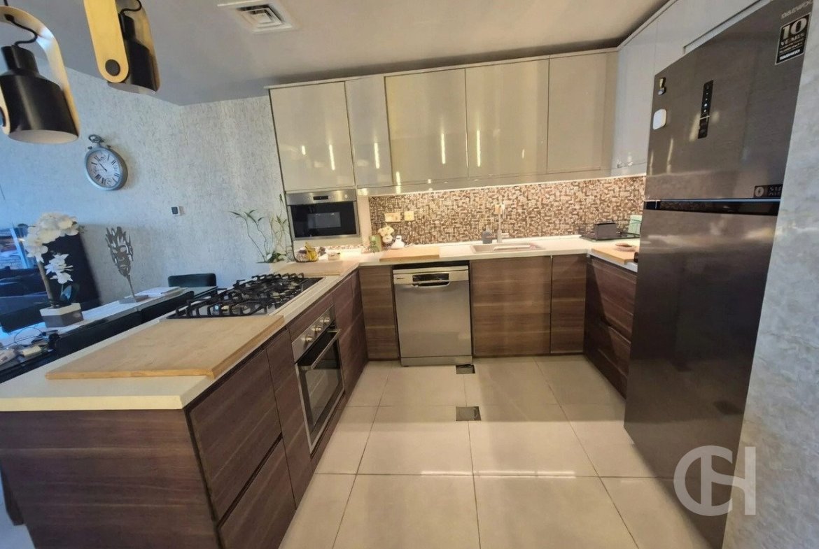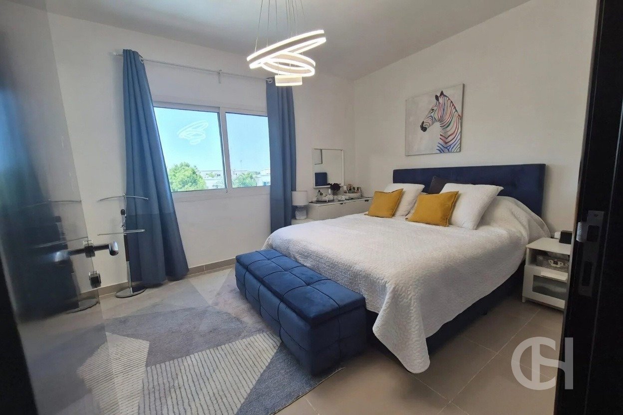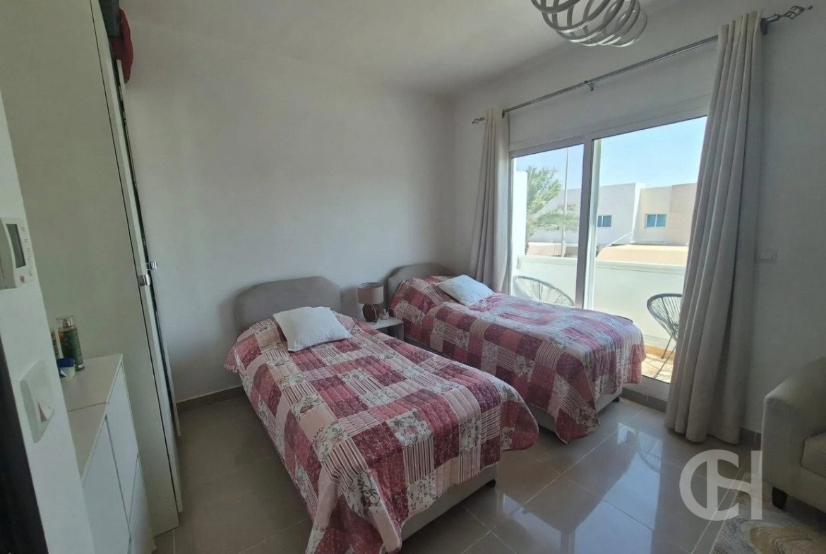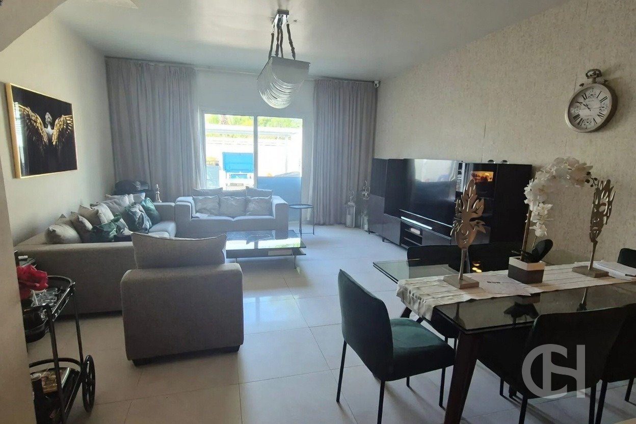 This 3 bedroom villa in Al Reef Villas is offered with a corner-unit position, single-row setting, and a private garden. The layout also includes a living and dining area, an open fitted kitchen, and separate maid’s, study, and storage rooms.