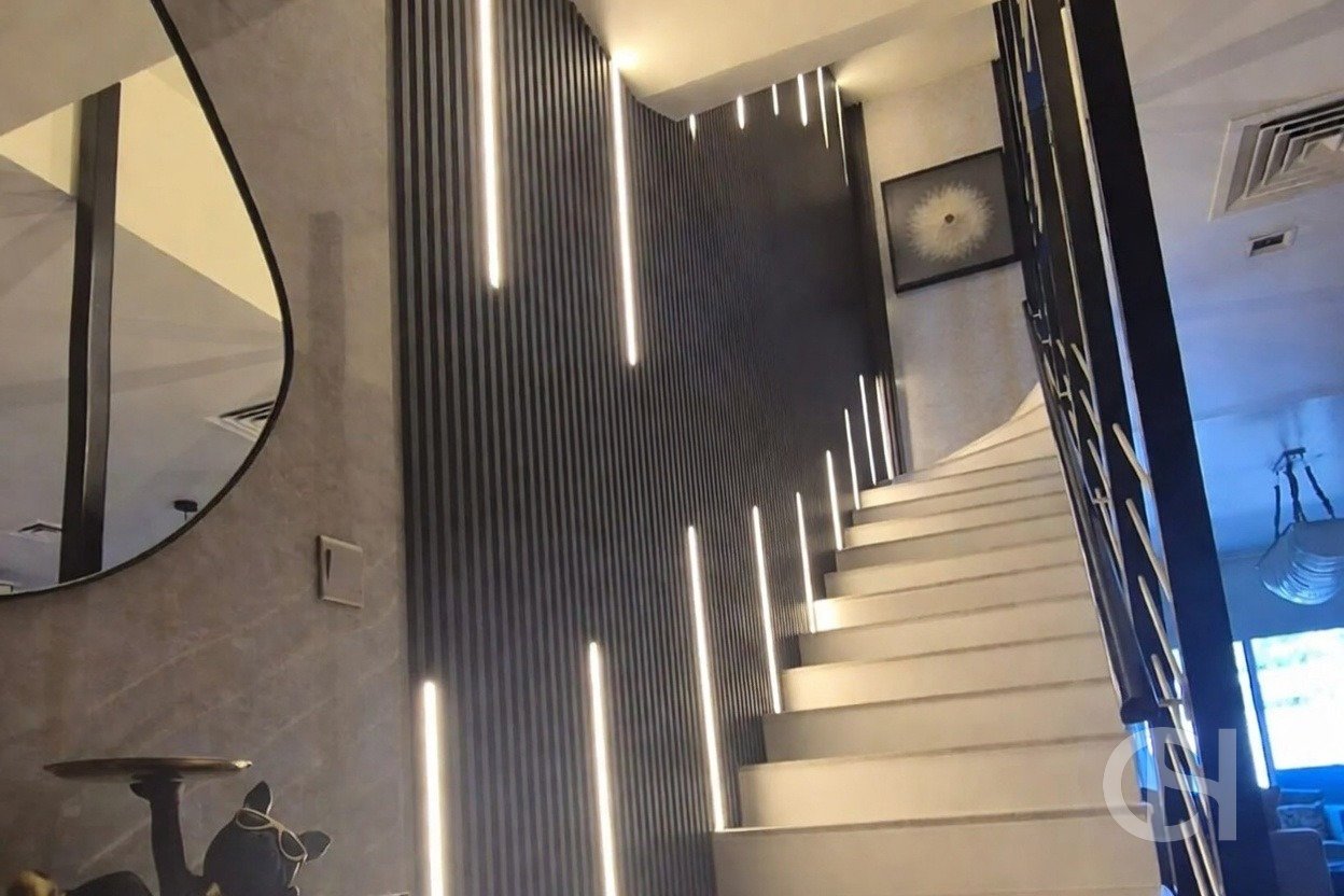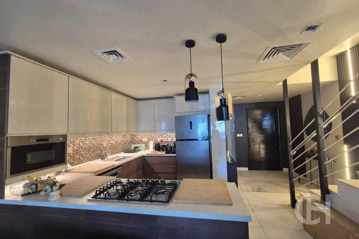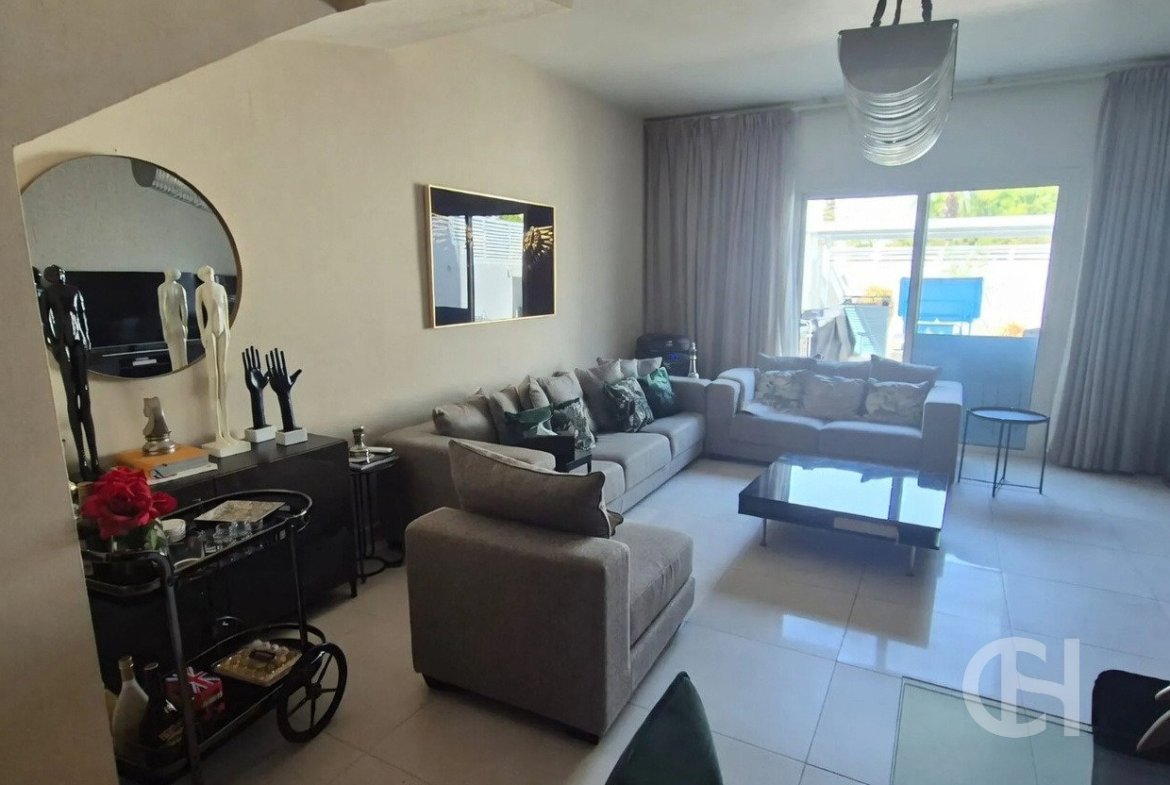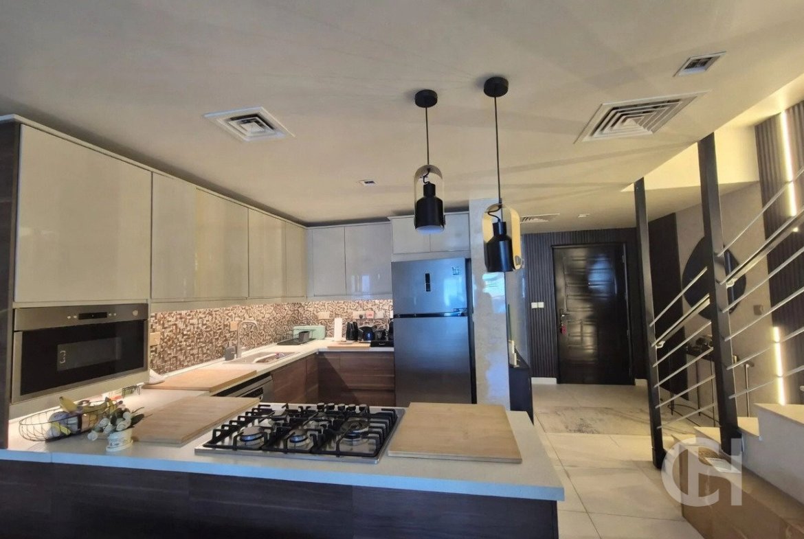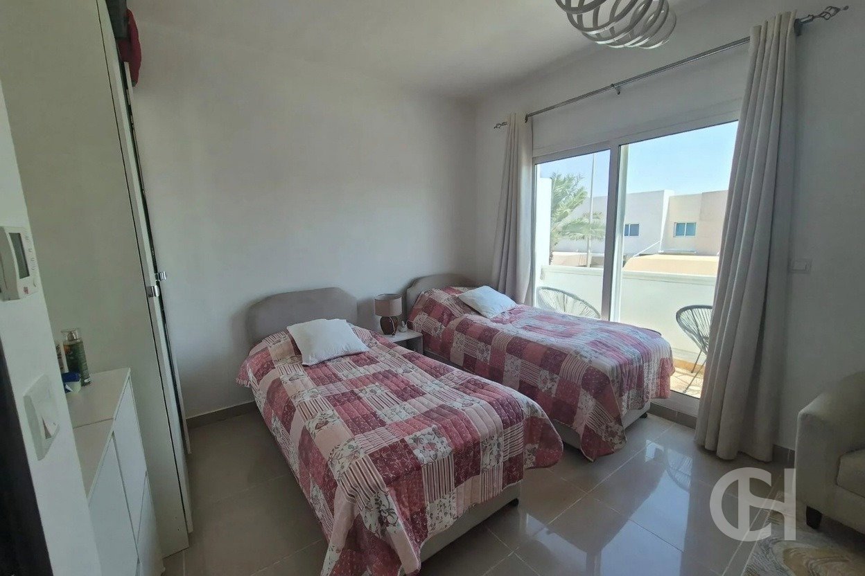 This 3 bedroom villa in Al Reef Villas is offered with a corner-unit position, single-row setting, and a private garden. The layout also includes a living and dining area, an open fitted kitchen, and separate maid’s, study, and storage rooms.